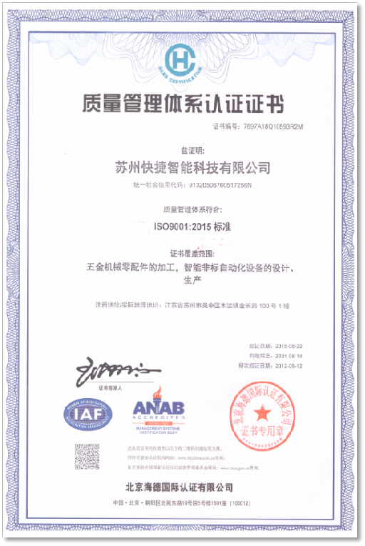 截止2025年,快捷智能已榮獲國家高新技術(shù)企業(yè)、科技型中小企業(yè)、瞪羚企業(yè)、專精特新中小企業(yè)、企業(yè)技術(shù)中心等多項榮譽(yù),通過質(zhì)量管理體系認(rèn)證等多項企業(yè)和產(chǎn)品認(rèn)證。